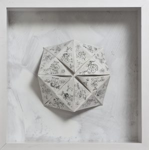 Origami Kwa-kuwa with peach. Gesso and ink on recycled paper. 42X42X8 cm. 2014