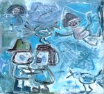 Variations on hugs in blue . Acrylic, carbon, graphite and colored chalks on canvas . 90X100 cm. 2012